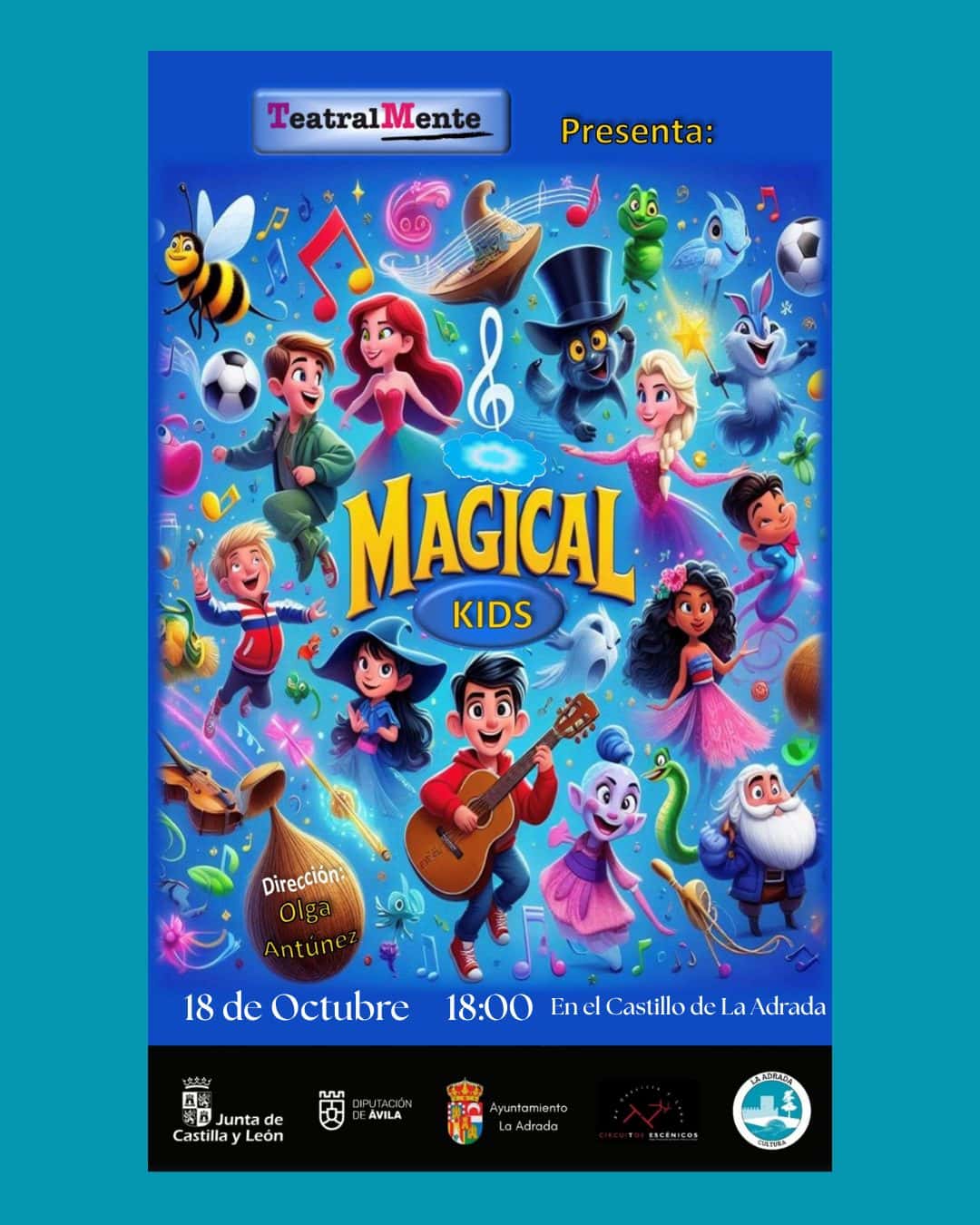 La compañía TeatralMente presenta Magical Kids, un divertido musical infantil dirigido por Olga Antúnez, donde los personajes más mágicos y queridos de los cuentos cobran vida en un espectáculo lleno de música, color y fantasía.