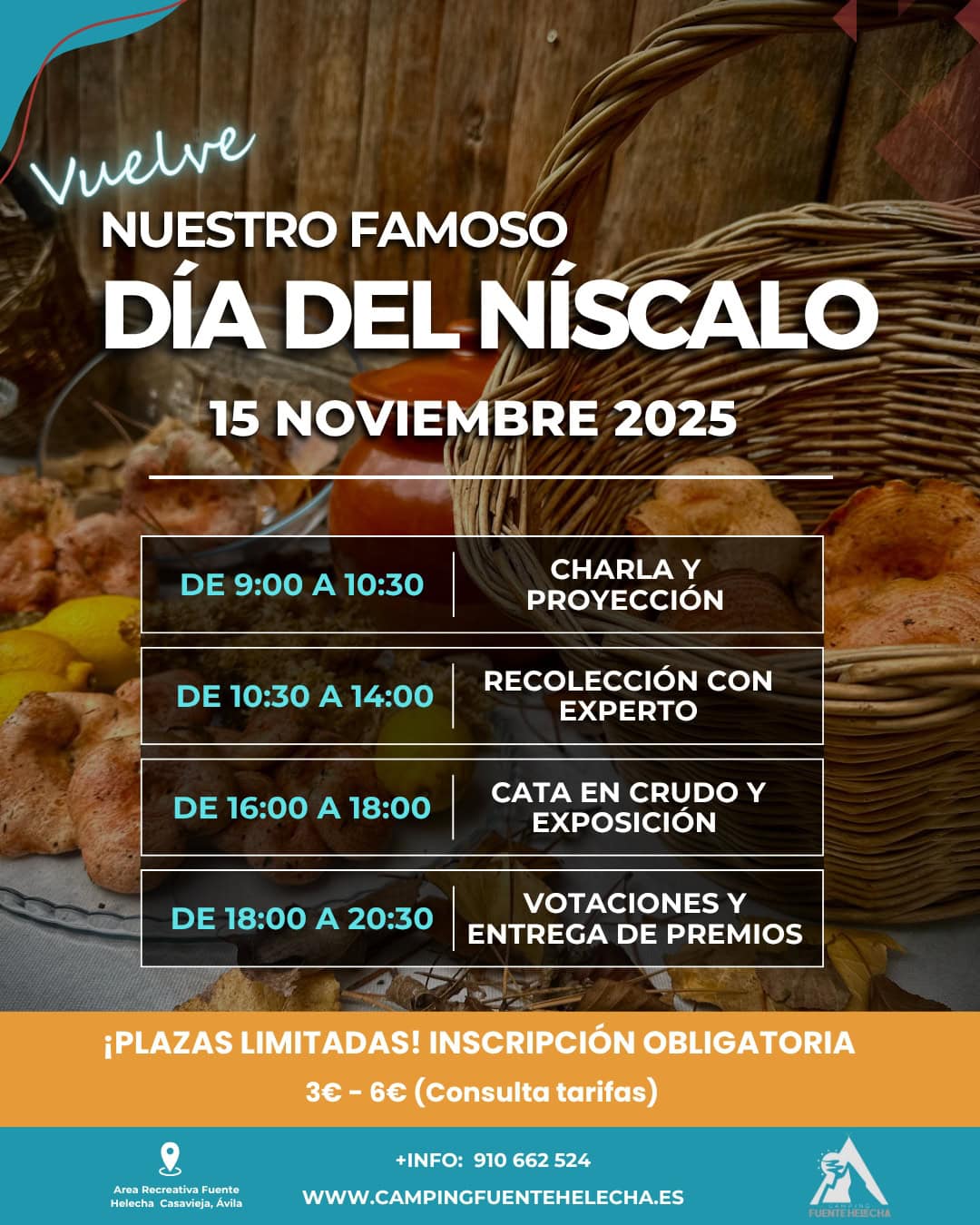🍄 Día del Níscalo 2025 – Camping Fuente Helecha 📅 Fecha: Sábado, 15 de noviembre de 2025📍 Lugar: Área Recreativa Fuente Helecha, Casavieja (Ávila)💰 Inscripción obligatoria: 3 € – 6 € (consulta tarifas)📞 Información y reservas: 910 662 524🌐 www.campingfuentehelecha.es Vuelve una de las jornadas más esperadas del otoño en el Valle del Tiétar: el […]