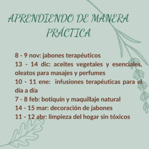 Cada taller combina práctica y conocimiento, para que te lleves a casa lo que elaboras y aprendas a usar las plantas en tu día a día 🍃