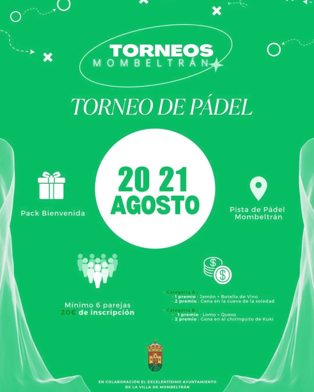📅 Fechas: 20 y 21 de agosto 📍 Lugar: Pista de Pádel de Mombeltrán 💰 Inscripción: 20 € por pareja (mínimo 6 parejas) 🎁 Incluye: Pack de bienvenida para todos los participantes