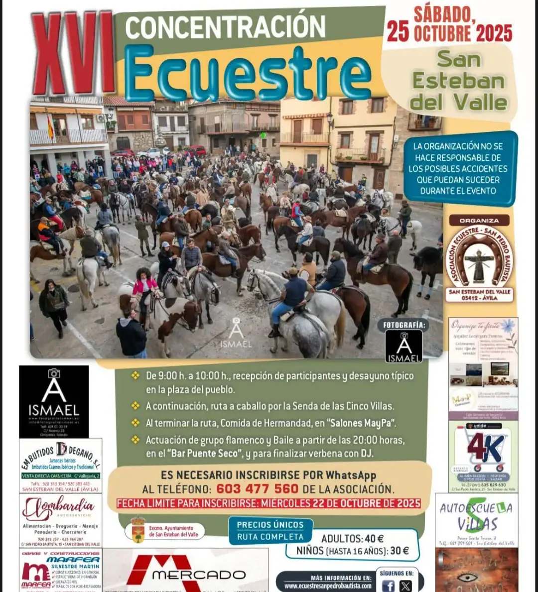 El próximo sábado 25 de octubre de 2025, San Esteban del Valle acoge la XVI Concentración Ecuestre, un evento que reúne a jinetes y aficionados del mundo del caballo en una jornada de tradición, naturaleza y convivencia.