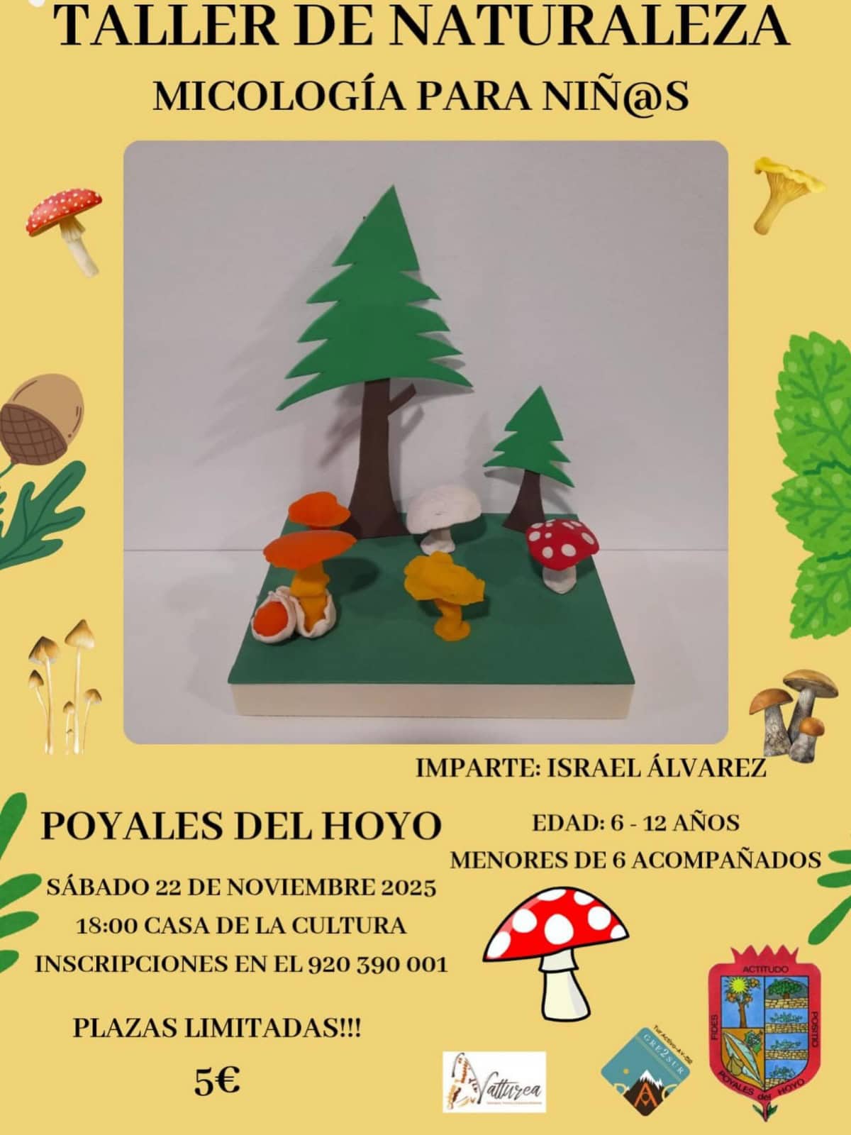 Poyales del HoyoTaller de Naturaleza – Micología para Niñ@s (Poyales del Hoyo) 📅 Fecha: Sábado 22 de noviembre de 2025🕒 Hora: 18:00📍 Lugar: Casa de la Cultura, Poyales del Hoyo💰 Precio: 5€🎟️ Inscripciones: 920 390 001👦👧 Edades: 6–12 años (menores de 6 acompañados)🎨 Imparte: Israel Álvarezℹ️ Plazas limitadas El taller ofrece una actividad educativa y divertida para […]