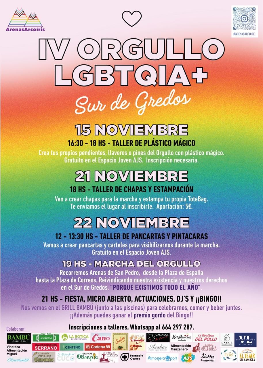 Arenas de San Pedro Pl. del Ayuntamiento, 1, Arenas de San Pedro, Ávila, Spain🏳️🌈 IV Orgullo LGBTQIA+ Sur de Gredos – Arenas de San Pedro 📅 Fechas: del 15 al 22 de noviembre de 2025📍 Lugar principal: Espacio Joven AJS y distintos puntos de Arenas de San Pedro👥 Organiza: Arenas Arcoíris en colaboración con AJS y entidades locales El IV Orgullo LGBTQIA+ Sur de Gredos llega con una […]