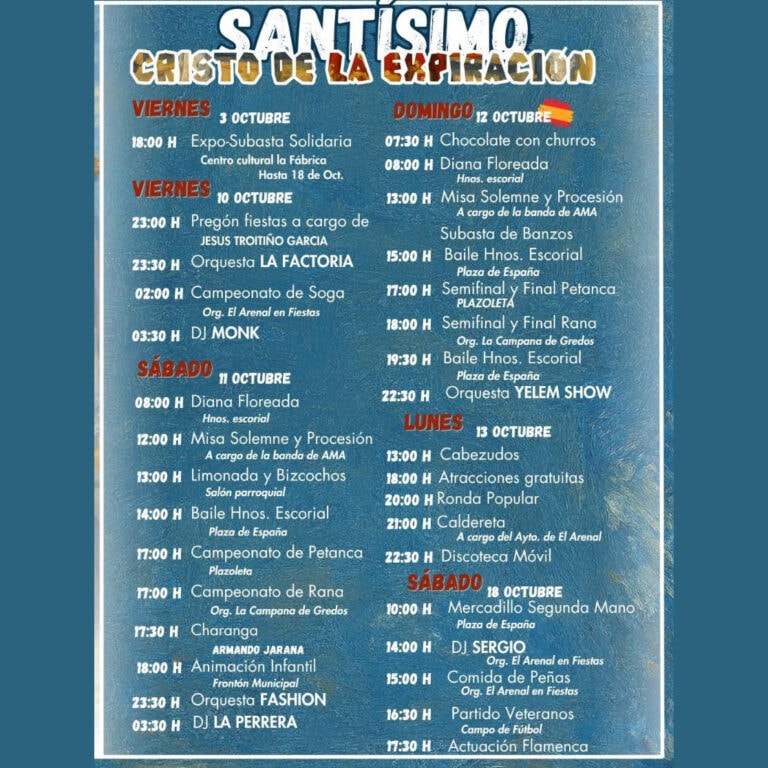8 octubre, 2025FiestasFiestas del Santísimo Cristo de la Expiración – El Arenal 2025Continuar leyendoFiestas del Santísimo Cristo de la Expiración – El Arenal 2025