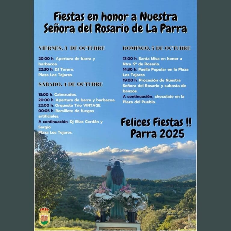 3 octubre, 2025FiestasFiestas en honor a Nuestra Señora del Rosario – La Parra 2025Continuar leyendoFiestas en honor a Nuestra Señora del Rosario – La Parra 2025